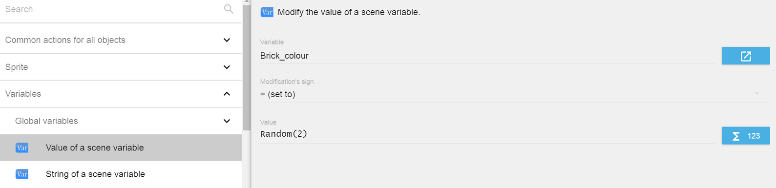 • Click Variables > Value of a scene variable.